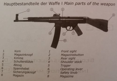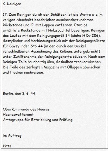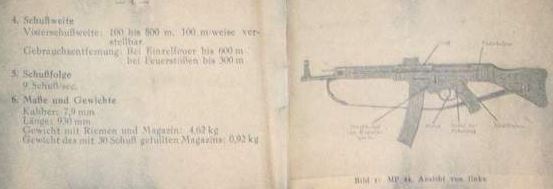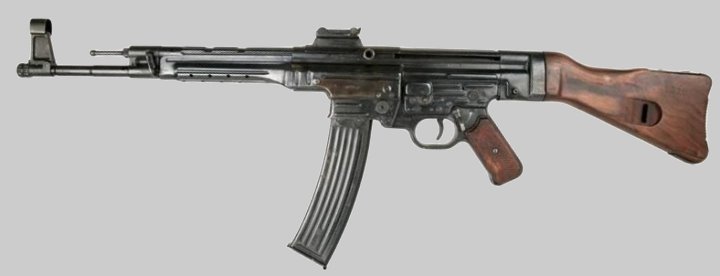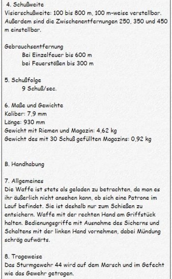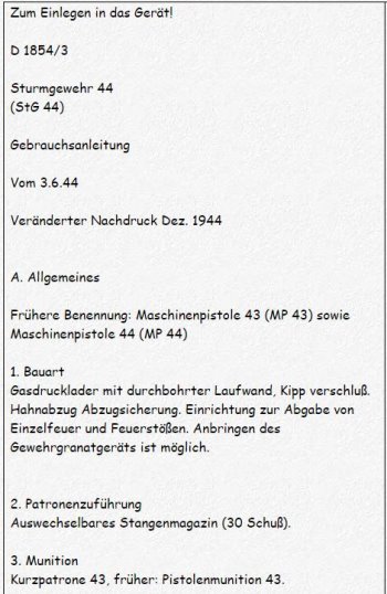 Bezeichnung: StG 44 / MP 44 Kategorie: Sturmgewehr Entwickler: C.G. Haenel / Sauer & Sohn / Steyr-Daimler-Puch Land: Deutsches Reich Entwicklungszeitraum: 1941 - 1943 Herstellungszeitraum: Okt. 1943 bis Mai 1945 Maße: Geamtlänge = 940 mm, Gewicht ungeladen = 4,62 kg, Lauflänge = 420 mm Kaliber: 7,92 x 33 mm Magazinkapazität: 30 Patronen im Kurvenmagazin (gebogenes Stangenmagazin) Kadenz: 500 Schuss pro Minute Feuerarten: Einzel- / Dauerfeuer (Vollautomat) Züge: 4 Züge mit Rechtsdrall Offene Visierung: Justierbar Technik: Gasdrucklader mit Kippblockverschluss Info: Zunächst wurde die Waffe als Maschinenpistole 44 (“MP44”) bezeichnet, dann im April 1944, ohne technische Änderungen, entsprechend der eigentlichen Waffenkategorie in Sturmgewehr (“StG44”) umbenannt.