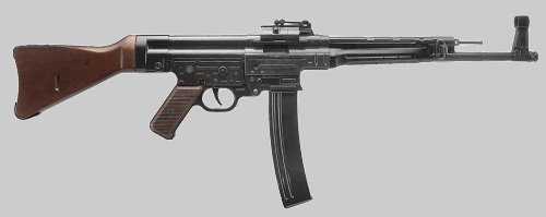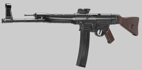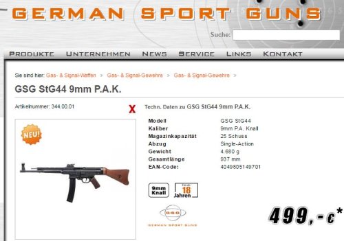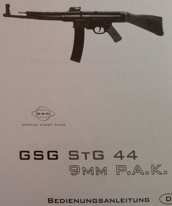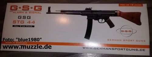 Herteller: G.S.G. “German Sport Guns” Modell: GSG StG44 Vorbild: Sturmgewehr StG44 / MP44 Markteinführung: Dezember 2016 PTB-Nr.: 1010 Kaliber: 9 mm P.A.K. (Pistole Automatik Knall) Magazinkapazität: 25 Schuss Abzug: Single Action (Einzelschussabgabe) Gesamtlänge: 937 mm Gewicht: 4.680 g Ausführung: Schreckschusswaffe im Zinkdruckgussverfahren gefertigt - mechanische Teile und Stoßboden aus Stahl - Anschlagschaft aus Holz - Handgriffschalen aus Polymer - Stahlblechmagazin - Werkzeugfach im Anschlagschaft Zubehör: Manual - Ladehilfe - Reinigungsbürste - Umverpackung = Pappkarton Bemerkung: Knallwaffe in Deutschland frei ab 18 Jahren - gegen Erwerbsberechtigung auch im Kaliber .22 lr erhältlich Preis im Internethandel: ca. 480,- bis 500,- EUR (2016)