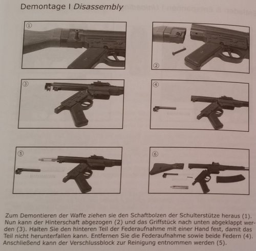 Bild unten: Demontage des “GSG StG44”: Zuerst wird der vorne im Schaft steckende Haltebolzen seitlich herausgezogen. Nun kann der Hinterschaft vom Gehäuse abgezogen werden. Dann das im Gehäuse steckende Gegenlager etwas eindrücken und die angelenkte Abzugseinheit nach unten abklappen. Der Verschluss nebst Feder kann nun nach hinten entnomen werden.