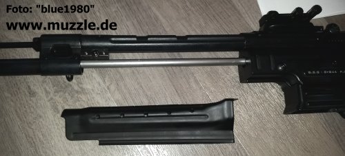 Foto unten: Der hier von der Waffe abgenommene Handschutz besteht aus Stahlblech und gibt den Blick auf das silberne Laufrohr frei.