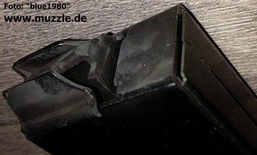 Foto unten: Blick auf das Kopfende des Stahlblechmagazins. Die Magazinlippen, welche die oberste der eingefüllten Kartuschen gegen den Druck der Magazinfeder halten, sind sehr stabil ausgeprägt. Da verbiegt sich nichts...