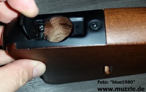 Bild unten: Eine kleine, gefederte Klappe verschließt die Aushöhlung im hölzernen Anschlagschaft. Dort ist Platz für ein Reinigungsset.