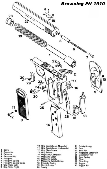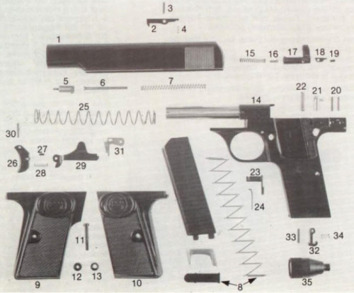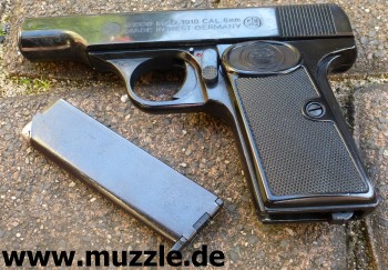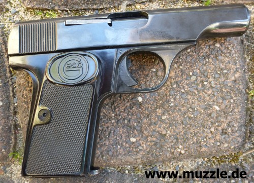 Abzug: SAO (Single Action Only) Lauf: Stahlrohr mit Laufsperre Sicherung: Manueller Schwenkhebel linksseitig hinter dem Züngel blockiert die Abzugsmechanik Visierung: Starr Visierlinie: 135 mm Länge: 153 mm Höhe: 100 mm Breite: 28 mm Gewicht: 498 g (leer) Ausführung: Griffstück und Schlitten bestehen aus Druckguss, geschwärzt - schwarze Kunststoffgriffschalen (am Griffrücken zusammenlaufend) - Lauf, Schlagbolzen und Auszieherkralle, sowie einige Kleinteile aus Stahl, Stahlblechmagazin. Lieferumfang: Waffe, Signalbecher, Laufreinigungsbürste und Bedienungsanleitung im Pappkarton. Bewertung: Kompakte Taschenpistole - hochwertiger Gesamteindruck - perfekte Bauteilpassungen - sauberes Finish - heute eher Sammlerstück (je nach Zustand) als Gebrauchsgegenstand. Hinweis: Die “Geco 1910” basiert technisch weitgehend auf dem Modell “HS5A” - Die “Browning”-Replik wurde später mit Modifizierungen (z. B. geschwächtes Patronenlager) unter der PTB- Nummer 421 herausgegeben.