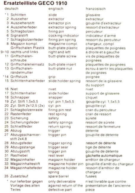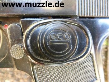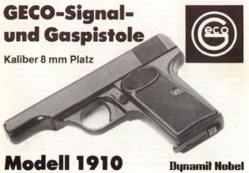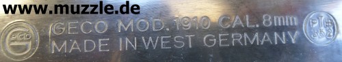 Hersteller: “H. Schmidt Waffentechnik” Fertigung: Made in Germany Anbieter: “Dynamit Nobel” unter dem Handelsnamen “Geco” Modell: 1910 PTB-Nr.: 352 Vorbild: FN Browning 1910, belgische Selbstladepistole - (Behördenwaffe, auch bei der Deutschen Wehrmacht im Einsatz), Fertigung bei “Fabrique Nationale Herstal”, Konstrukteur: John Moses Browning Beschusszeichen: Nitrobeschuss, Beschussamt Mellrichstadt, Jahr 1984 (siehe Bild unten rechts)