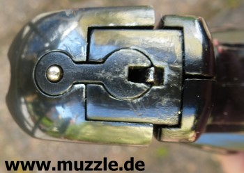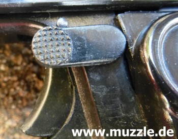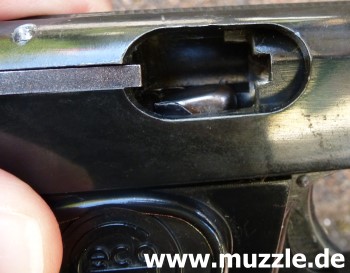 Fotos unten: Ein Stift am Heck der Waffe zeigt an, ob sich der Schlagbolzen im gespannten (linkes Bild) oder entspannten Zustand (rechtes Foto) befindet.