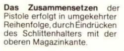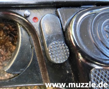 Fotos oben und unten: Die Platzierung der Sicherung ist das optisch auffallendste Merkmal bei der Unter- scheidung zwischen Original (Bild oben rechts) und der Replik (unten). Bei der scharfen Großkaliberwaffe blockiert die Sicherung auch den Schlitten, bei der Schreckschusswaffe ist das nicht der Fall.