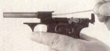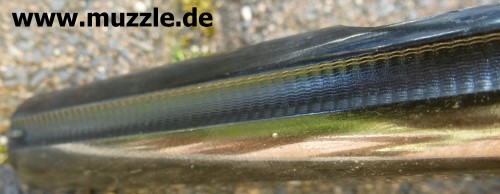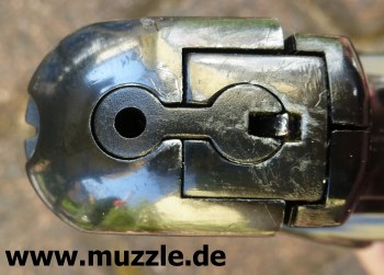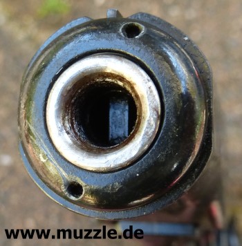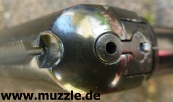 Fotos unten, links: Mündungsansicht mit Laufsperre, rechts: Offenes Hülsenauswurffenster und Ausszieher- kralle bei zurückgezogenem Schlitten.
