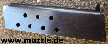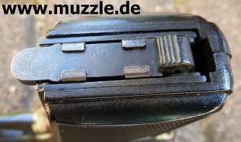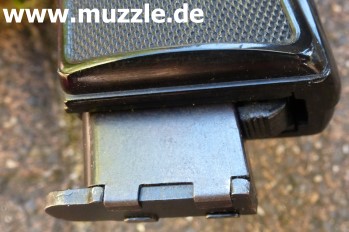 Fotos unten: Blick auf den Griffboden. Das Stahlblechmagazin und der federbelastete Magazinhalter. Bewegt man diesen in Richtung Griffrücken, wird das 7-schüssige Magazin freigegeben und kann entnommen werden.