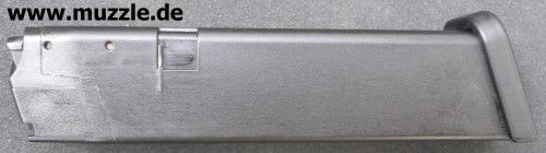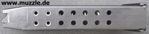 Das Kunststoffmagazin hat ein sehr komfortables Fassungsvermögen von 17 Patronen. Der Entriegelungsknopf