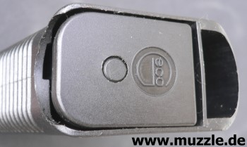 Heckansicht. - Beim Betätigen des Abzuges bewegt sich das runde Schlagstück ca 5 mm heraus.
