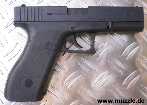 Ausführung: Kunststoffgriffstück schwarz, Schlitten Zinkdruckguss brüniert, Stahllauf, Kunststoffmagazin