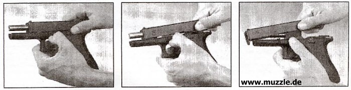 schwer, gleichzeitig die Verschlusssprerre mit der anderen Hand zu betätigen und die Pistole noch sicher zu halten.