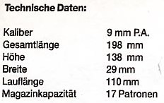 Techn. Daten: Kaliber 9x19 mm, Länge 186 mm, Gewicht 905 g, Abzugswiderstand 2.500 g, Magazinkpazität 17 Schuss.