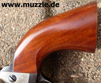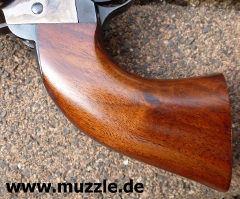 Fotos unten: Die hochwertigen, kastanienbraunen Griffschalen aus Nussbaumholz sitzen perfekt.