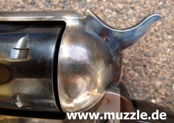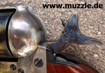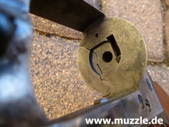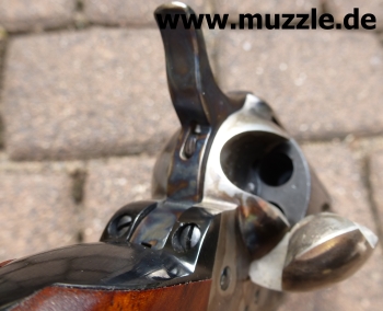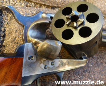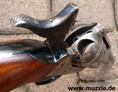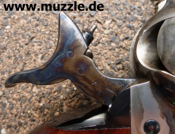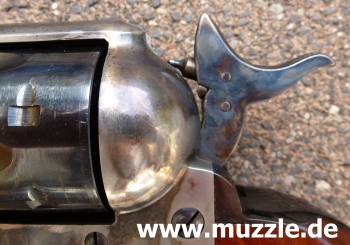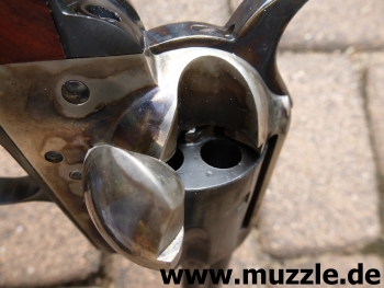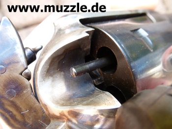 In die Position gebracht, wie im Bild unten links, lässt sich Trommel per Hand von Kammer zu Kammer weiter- drehen. So kann man eine Patrone nach der anderen laden, bzw. die leeren Hülsen auswerfen. Das Foto rechts - und die Bilder darunter - zeigen jeweils den gänzlich gespannten Hahn vor Schussauslösung.