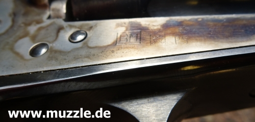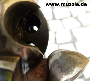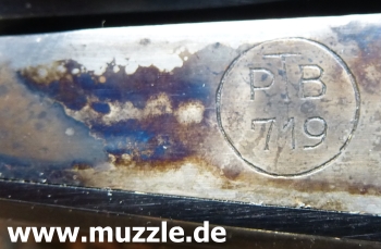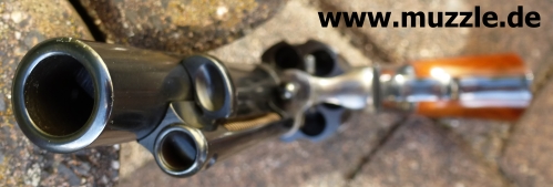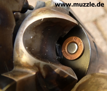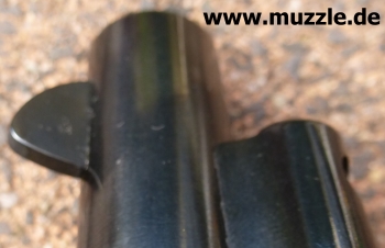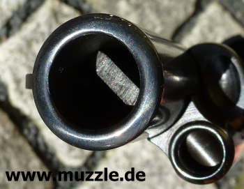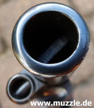 Fotos unten: Mündungsansicht. Deutlich erkennbar die schrägstehende (45° Winkel) Laufsperre, die etwa 15 mm hinter der Mündung ansetzt. Ein Gewinde für einen Signalbecher gibt es nicht.