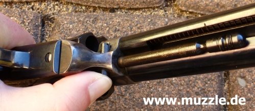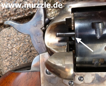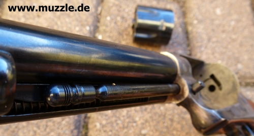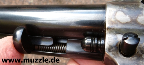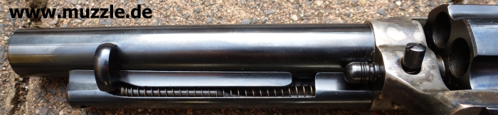 Fotos unten: Das Ausstoßergehäuse unter dem Lauf. Zieht man Schieber gegen die Federbelastung nach hinten, dann drückt der Stift die Patronenhülse aus der Trommelkammer durch die Ladeöffnung heraus.