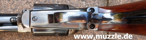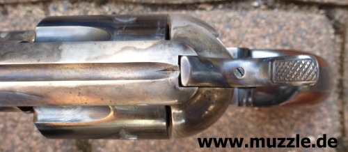 Fotos unten: Der SAA Army-Revolver besitzt natürlich keinen Trommelkran mit dem sich die Trommel zum Laden seitlich ausschwenken ließe, sondern hat eine Ladeklappe auf der rechten Rahmenseite. Durch die so entstehende Öffnung werden die Patronen nach und nach in die sechs Kammern geladen.