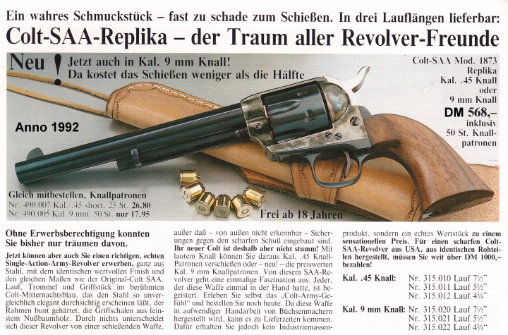 Ausführung: Vollstahlwaffe “blue-finish” (gebläut) / Rahmen bunt gehärtet / Griffschalen Nussbaumholz Bewertung: Sehr hochwertige Verarbeitungsqualität, Handarbeit Rechtliches: Besitz der Waffe frei ab dem vollendeten 18. Lebensjahr. Öffentliches Führen nur erlaubt mit dem “Kleinen Waffenschein”, zwingend in Verbindung mit einem gültigen Personaldokument (Ausweispapiere). Preis 1992: 568,- DM (Zeughaus HEGE) Preis 1999: 598,- DM (Frankonia)