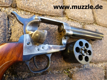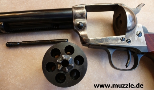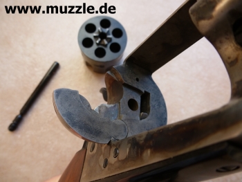 Fotos unten: Beim “HEGE Army 1873” mit PTB-Nummer 719 lässt sich die Trommel zu Reinigungszwecken mit wenigen Handgriffen gänzlich entnehmen. Zunächst drückt man den Sperrbolzen zur Seite und zieht dann die Trommelachse nach vorne heraus. Dann die Ladeklappe öffnen und schon ist die Trommel frei und kann nach rechts herausgenommen werden.