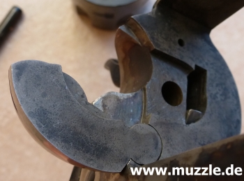 Fotos unten: Links der Blick auf den Laufansatz bei ausgebauter Trommel. Hier erkennt man die außermittige Lauföffnung, die neben der implemetierten, massiven Laufsperre einen ggf. erfolgenden illegalen Aufbohr- versuch zuverlässig verhindert. Unter dem Lauf sieht man die Öffnung für die Trommelachse, daneben die Bohrung für den Entladestift der im Ausstoßergehäuse sitzt. Auf dem rechten Bild sind die Umrisse der Ladeklappe zu sehen und rechts neben der runden Aufnahme- bohrung für die Trommelachse, die Transportklinke. Diese ist für die Trommelrotation (nach rechts) verant- wortlich und führt diese mittels einer Aufwärtsbewegung beim Hahnspannen aus.