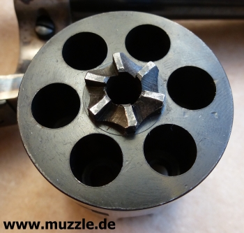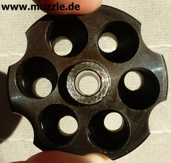 Fotos unten: Blick auf die entnommene Trommel, links Frontansicht (Mündungsansicht). Hier erkennt man die nicht zentrierten, also außermittigen Bohrungen. Das Laden scharfer Projektilmunition ist somit unmöglich, es kann nur kurze Kartuschenmunition (Platzpatronen Kal. 9 mm K) geladen werden. Auf dem rechten Foto sieht man die Transportrastung auf der Rückseite der Trommel (Ladeansicht). Dort greift die Tranportklinke hinein und diese dreht die Trommel beim Spannen des Hahns dann exakt eine Kammer weiter.