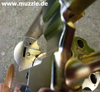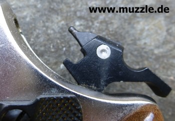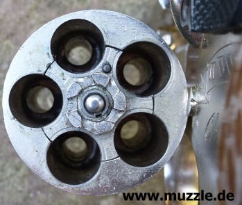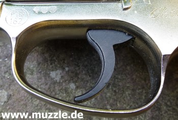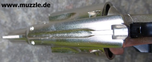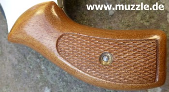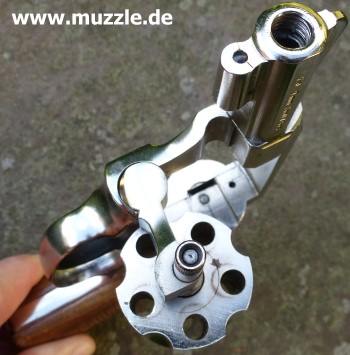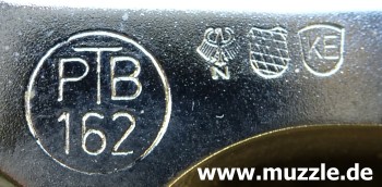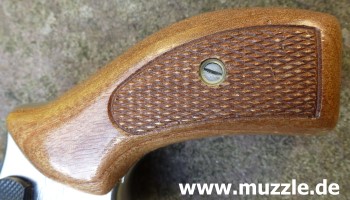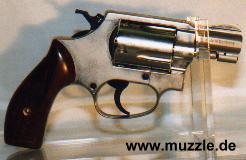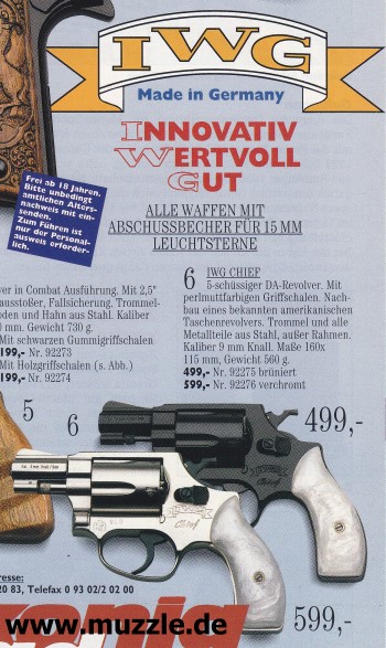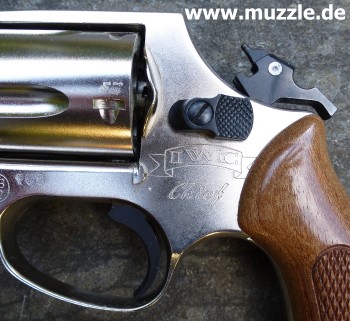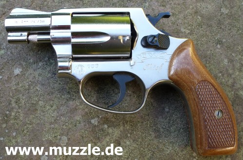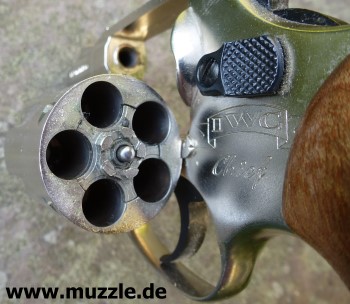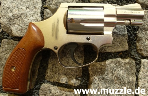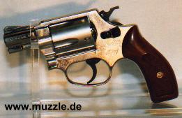 Länge: 160 mm Höhe: 107 mm Breite: 33 mm Gewicht: ca. 560 g (leer) Ausführung: Nickelfinish - Zinkgussgriffstück - Holzgriffschalen - Bedien- und Funktionsteile Stahl (z. B. Trommel, Trommel- achsenhalterung, Abzug, Lauf, Schlagbolzen, Stoßboden) Bemerkung: Revolver nahezu baugleich mit dem “ERMA EGR66” (PTB 162). Lieferumfang: Waffe, Signalbecher, Reinigungsbürste, Bedienungsanleitung im Kunststoffkoffer. Bewertung: Technisch und optisch sehr saubere Verarbeitungsqualität. Funktionstest: Lediglich mechanische Funktion geprüft, keine Schusstests mit Munition durchgeführt. Bemerkungen: Der Firmenname “ERMA” leitet sich ab von “Erfurter Maschinenfabrik”, die Modellbezeichnung “EGR” steht für “ERMA” Gasrevolver. Das Unternehmen baute Gas-/Signalwaffen von 1974 bis zu seinem Erlöschen 1997. Preis 1997: 349,- DM Rechtliches: Besitz der Waffe frei ab dem vollendeten 18. Lebensjahr. Öffentliches Führen nur erlaubt mit dem “Kleinen Waffenschein”, zwingend in Verbindung mit einem gültigen Personaldokument (Ausweispapiere). ================================================================= Das Vorbild: “Smith & Wesson Model 36 Chief’s Special” Hersteller: “Smith & Wesson” Fertigungszeitraum: 1950 bis heute Kaliber: .38 S&W Special Kapazität: 5 Patronen Lauflänge: 1.875” (4,7 cm) und 3” Visierung: Starr Abzug: SA/DA