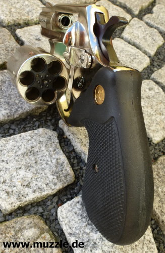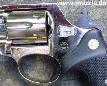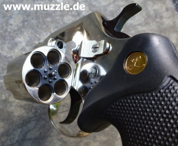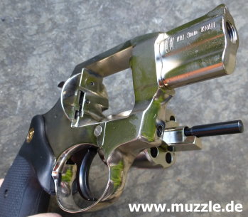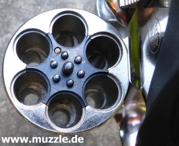 Fotos unten: Die Trommel fasst 6 Patronen im Kalber 9 mm (.380). Sie wird nach links aus dem Rahmen ausgeschwenkt. Ein Ausstoßerkranz, mit dessen Hilfe die leeren Kartuschen leichter aus den Kammern entfernt werden könnten, ist leider nicht vorhanden.