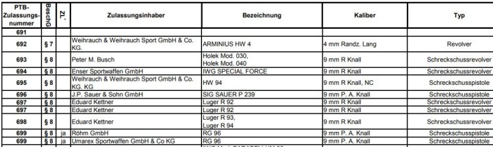 Der tschechische Hersteller “ALFA-proj” fertigt seit seiner Gründung 1993 Waffen und einschlägiges Zubehör. Dazu gehören u. a. auch Gas-/Signalrevolver. Lizenzprodukte werden unter verschiedenen bekannten Namen wie z. B. “Luger” vermarktet. Auch deutsche Firmen lassen Schreckschussrevolver bei “ALFA-proj.” herstellen (siehe Liste unten) und bringen diese unter eigenen Handelsnamen in Umlauf. Dabei basieren alle Revolver auf dem gleichen Rahmen, unterscheiden sich aber bei Lauflänge, Beschriftung, Finishing und den Griffschalen. Dynamit Nobel GmbH: GECO 890 (PTB732 und 734) Eduard Kettner: Luger R 92 (PTB 697), Luger R 93 (PTB 698 und 776), Luger R 94 (PTB 698) Enser Sportwaffen GmbH – “IWG”: Shield RD 2 (PTB 728), Shield RD 3 (PTB 729), Shield RD 4 (PTB 730), Shield RD 6 (PTB 737) Frankonia Jagd Hofmann GmbH & Co. KG: Mercury M.1 Lightning (PTB 751), Mercury M.2 Thunder (PTB 752) Leader Trading GmbH: ALFA 2 Modell 2000 (PTB 761) Manfred Alberts GmbH: VOX 2000 (PTB 726) Peter M. Busch: Holek Mod. 020 (PTB 711), Holek Mod. 030 (PTB 693), Holek Mod. 040 (PTB 693) Regina Koch Jagd- und Sportwaffen: Koch Modell 020 K (PTB 707), Koch Modell 030 K (PTB 708), Koch Modell 040 K (PTB 709) Schmeisser Suhl GmbH: Modell 020 (PTB 858) Umarex Sportwaffen GmbH & Co KG: ALFA 2 (PTB 593), ALFA 4 (PTB 593)