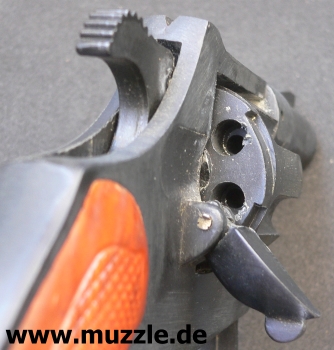 AusfĂŒhrung: brĂŒniert, Kunststoffgriffschalen, Trommel nicht ausschwenkbar sondern herausnehmbar, Lade- klappe rechtsseitig