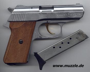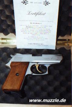 Ausführung: Druckguss, matt verchromt, Holzgriffschalen, Abzugszüngel vergoldet, Sicherungshebel linksseitig