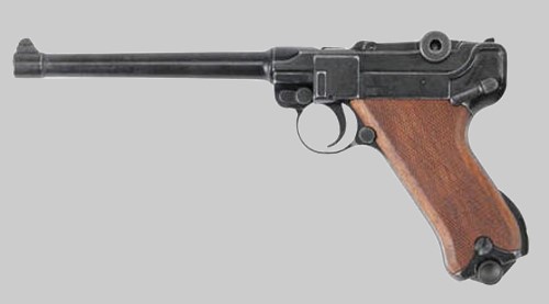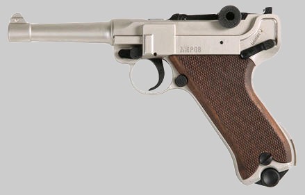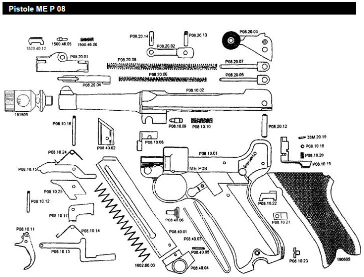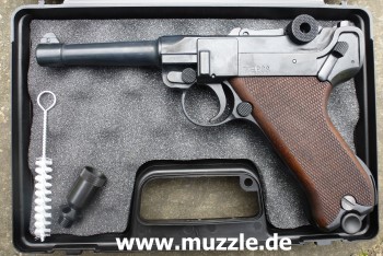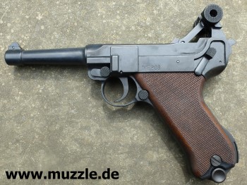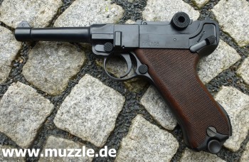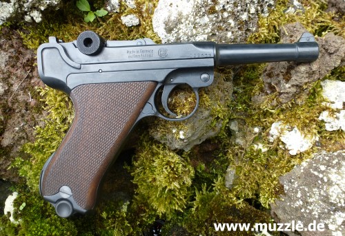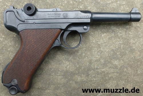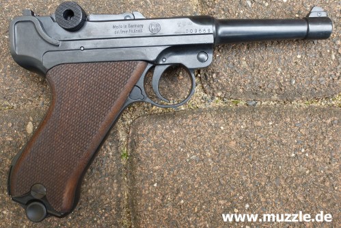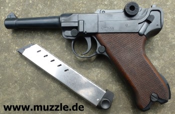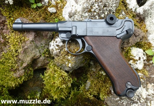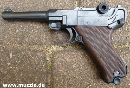 ================================================================= Das Vorbild: Die “Pistole 08” oder “Parabellum-Pistole”, auch unter dem Begriff „Luger“ bekannt, ist eine deutsche Selbstladepistole. Die 1908 im Deutschen Reich eingeführte Ordonnanzwaffe wurde von dem Österreicher Georg J. Luger (1849–1923) konstruiert (Entwicklungsjahre: 1893 bis 1908). Ihre Produktionszeit ist mit den Jahren 1893 bis 1945 angegeben. Die militärische Bezeichnung lautet: “Pistole 04”, “Pistole 08”, “Ari-08”. Technische Daten: Gesamtlänge: 233 mm, Lauflänge: 102 mm, Kaliber: 9 mm Parabellum, Magazinkapazität: 8 Patronen, Anzahl Züge: 6 mit Drall rechts, Visier: Offene Visierung, Verschlussart: Kniegelenkverschluss, Ladeprinzip: Rückstoßlader.