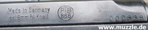 Serien-Nr.: 009669 System: Selbstlader, Reizstoff-/Signalpistole Kaliber: 9 mm P.A.K. - (Pistole Automatik Knall) Magazinkapazität: 6 Patronen, allerdings sollten gemäß Herstellerempfehlung nur 4 Patronen geladen werden Abzug: Single Action (SA) Lauf: Stahlrohr mit Laufsperre Lauflänge: 105 mm