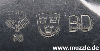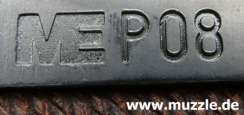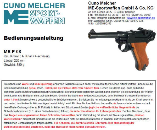 Hersteller: Cuno Melcher, ME-Sportwaffen GmbH & Co. KG, D-42677 Solingen Fertigung: Made in Germany Modell: “ME 08” PTB-Nr.: 866 Vorbild: “Luger P 08” Beschusszeichen: Nitrobeschuss, Beschussamt Köln, “BD” (B=1, D=3 -> 2013)