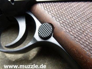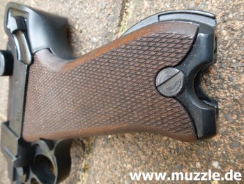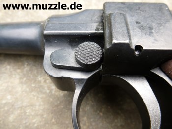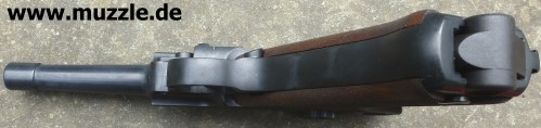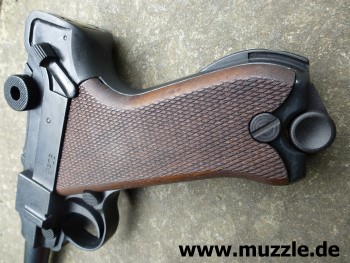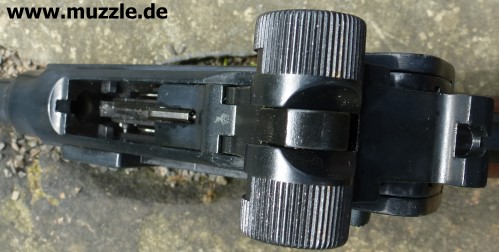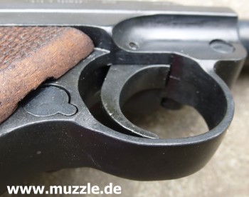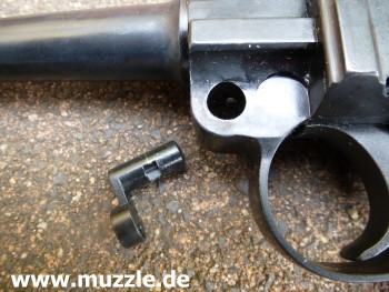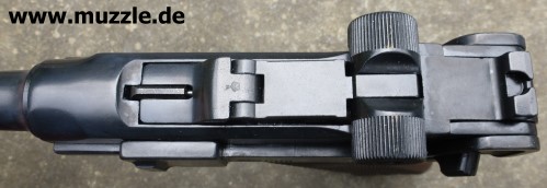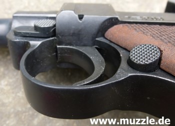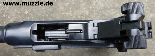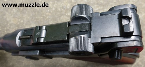 Verschluss / Abzug Fotos unten: Die Pistole besitzt einen reinen SA-Abzug, kann also nicht im Double-Action-Modus (Spannabzug) geschossen werden. Vor der ersten Schussabgabe wird der Kniegelenkverschluss bis zum Anschlag zurückgezogen und dann in seine Ausgangsposition zurückgleiten lassen. Das Schlagstück ist nun gespannt und die Pistole nach dem Entsichern schussbereit. Bei jedem Schuss wird der Verschluss durch den Gas-/Staudruck zurückgeworfen. Dadurch erfolgt das erneute Spannen (siehe Fotos unten). Der Verschluss bleibt bei entleertem Magazin nach dem letzten Schuss offen (Verschlussfang).