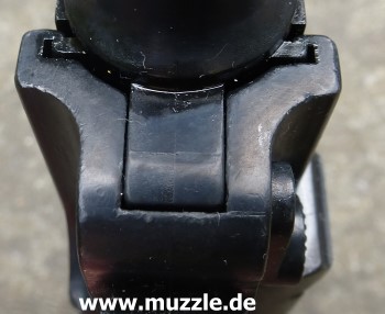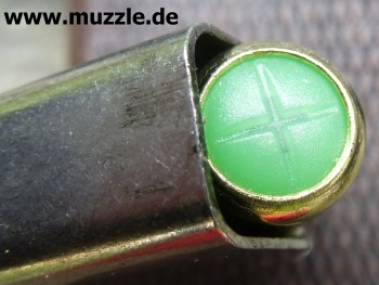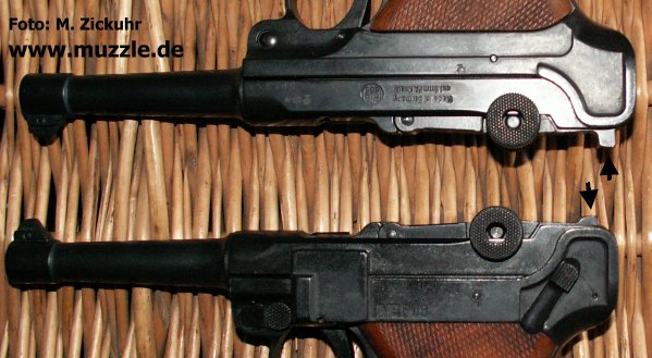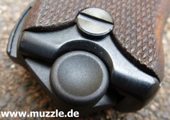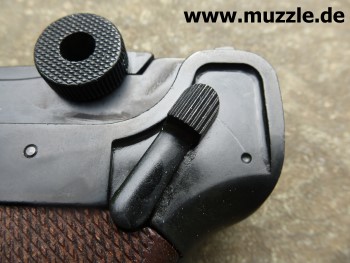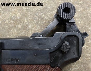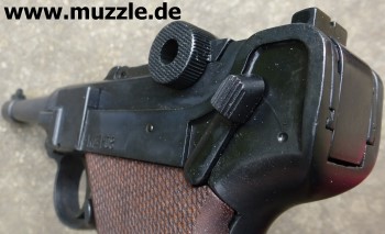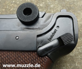 Sicherung Die “ME P08” ist mit einer optisch originalgetreuen, linksseitig zu betätigenden, manuellen Sicherung ausgerüstet (Fotos unten). Wird der Schwenkhebel in die untere Position gebracht (Schriftzug “gesichert” sichtbar), unterbricht dies die Abzugsmechanik. In der oberen Position des Hebels befindet sich die Waffe im Status “ungesichert” und wäre entsprechend schussbereit (Foto rechts). Der Hebel lässt sich leichtgängig betätigen und rastet an den jeweiligen Endpunkten deutlich ein (Rastkugel).