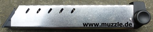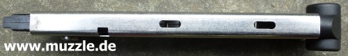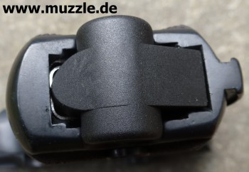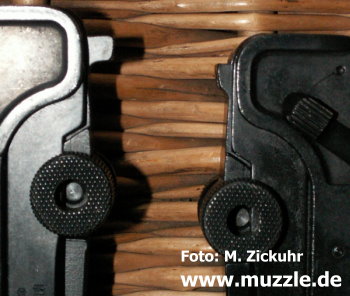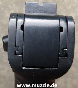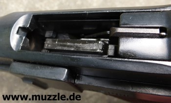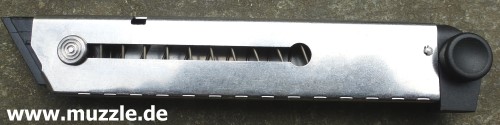 Magazin Um das Magazin entnehmen zu können, betätigt man den Druckknopf linksseitig am Griffstück hinter dem Abzugsbügel (Fotos unten). Das Magazin wird dann per Feder ein Stück weit aus dem Schacht herausbefördert und kann dann entnommen werden. Ungewöhnlich: Beim Einsetzen des Magazins muss der Knopf ebenfalls eingedrückt werden um es komplett implementieren zu können.