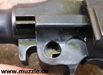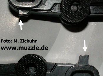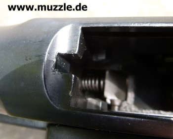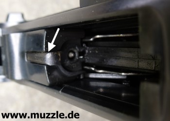 Foto unten rechts: Der weiße Pfeil im Bild deutet auf die Auszieherkralle, welche für den Hülsenauswurf nach der Schussabgabe sorgt.