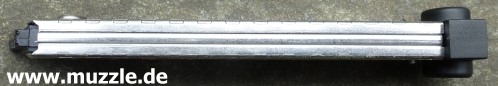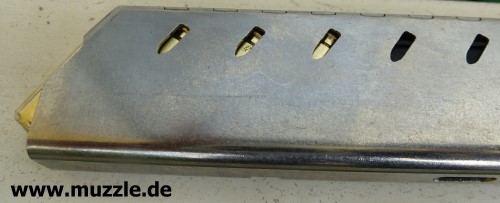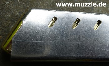 Fotos unten: Das Stahlblechmagazin fasst zwar insgesamt bis zu 6 Patronen, es sollten aber lediglich maximal 4 Stück geladen werden. So wird es vom Hersteller in der Bedienungsanleitung empfohlen. Vermutlich generiert eine gößere Bestückung u. U. Zuführungs- bzw. Funktionsstörungen. Beim Versuch das mit 6 Patronen geladene Magazin in den Schacht zu implementieren, scheiterte dies beim vorliegenden Exemplar. Das Magazin ließ sich nicht komplett einführen, stand einige Millimeter am Griffboden über und konnte somit nicht einrasten. Bei 5 Patronen ließ sich das Magazin zwar wie vorgesehen einsetzen, aber ich denke es ist dennoch ratsam sich an die Herstellerempfehlung zu halten und die Ladung auf nur 4 Kartuschen zu begrenzen. Im Innern des Mags sitzt eine sehr stramme Feder, was das Befüllen erschwert, da man den Zubringerknopf nur mit Mühe gegen die Kraft der Magazinfeder unten halten kann.