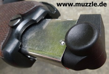 Magazinhalter Um das Magazin entnehmen zu können, betätigt man den Druckknopf linksseitig am Griffstück hinter dem Abzugsbügel (Fotos unten). Das Magazin wird dann per Feder ein Stück weit aus dem Schacht herausbefördert und kann dann entnommen werden. Ungewöhnlich: Beim Einsetzen des Magazins muss der Knopf ebenfalls eingedrückt werden um es komplett implementieren zu können.