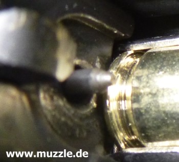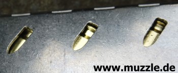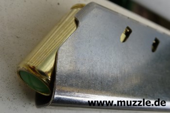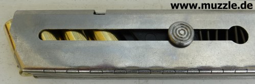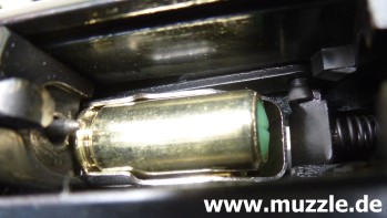 Fotos unten: Blick von oben in den Magazinschacht. Oberhalb der messingfarbenen Patrone ist der Schlagbolzen zu sehen.