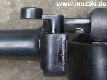 Nach dem Herausdrücken des Hintergelenkstiftes können die Gelenke mit dem Verschluss nach hinten aus dem Lauf herausgezogen werden. Der Zusammenbau erfolgt in umgekehrter Reihenfolge.