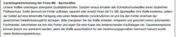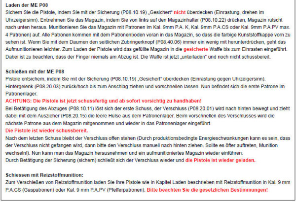 Sicherung: manuell (Schwenkflügel linksseitig), unterbricht die Abzugsmechanik Visierung: Visierlinie 195 mm Länge: 225 mm Höhe: 140 mm Breite: 38 mm Gewicht: 878 g (leer) Ausführung: Druckgusskorpus schwarz, Holzgriffschalen, Stahlblechmagazin Lieferumfang: Waffe, Signalbecher, Reinigungsbürste, Bedienungsanleitung im Kunststoffkoffer. Hinweis: Die “ME 08” gilt allgemein als munitionsfühlig. Preis 2014: ca. 180,- EUR (Internet) Rechtliches: Besitz der Waffe frei ab dem vollendeten 18. Lebensjahr. Öffentliches Führen nur erlaubt mit dem “Kleinen Waffenschein”, zwingend in Verbindung mit einem gültigen Personaldokument (Ausweispapiere).