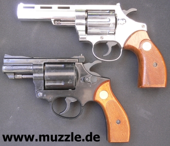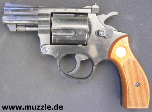 AusfĂĽhrung: Druckguss brĂĽniert, Holzgriffschalen, Trommelachse fungiert als PatronenausstoĂźer
