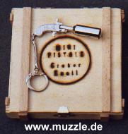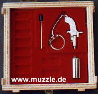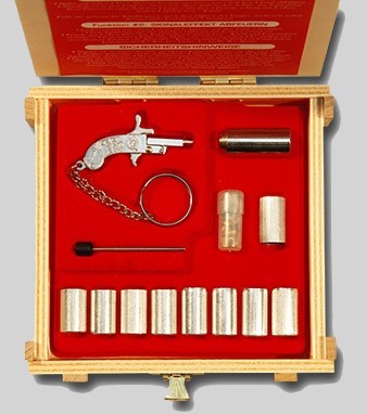 Niederösterreich hergestellt. 15 Einzelteile werden in 124 Arbeitsschritten zusammengebaut. Diese Pistole gibt es in der Ausführung Silber und 24 Karat vergoldet und wird entweder in einer schönen Blechdose oder in