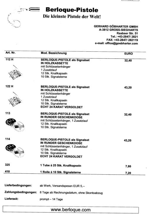 Anbieter. Es ist möglich, die Pistole auch beim Hersteller zu kaufen , direkt vor Ort oder mit Postversand - ebenso ist es möglich, das Zubehör zu beziehen (Knallpatronen und Leuchtsterne). Anbei eine Preisliste mit