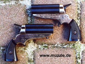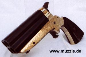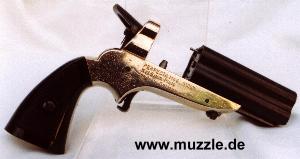 Vierläufiger Derringer, dessen “Hahn” ein rotierendes Schlagstück besitzt, welches die Patronen in den Läufen