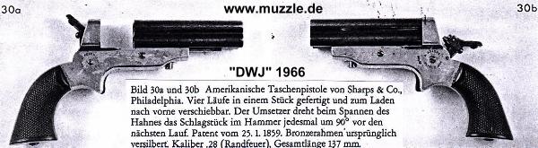 „Sharps & Co.“, Philadelphia. Vier Läufe in einem Stück gefertigt und zum Laden nach vorne verschiebbar. Der Umsetzer dreht beim Spannen des Hahnes das Schlagstück im Hammer jedes mal um 90 Grad vor den nächsten