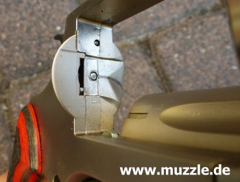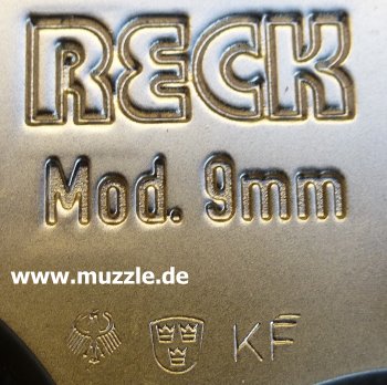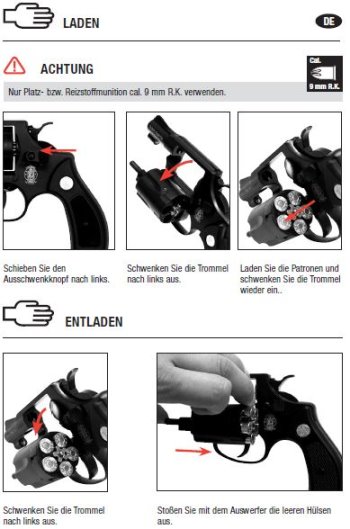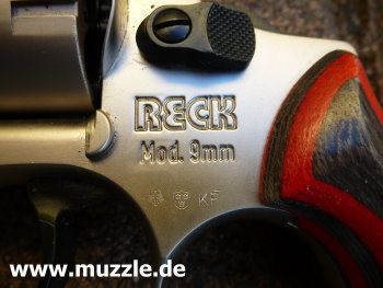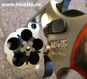 Schieber ist linksseitig über den “RECK”-Schriftzug angebracht (Foto unten rechts). Nun kann die Trommel zum Beladen nach links herausgeschwenkt werden. Sie hat 5 Kammern für Platz-/Reizstoffpatronen im Kaliber 9 mm.