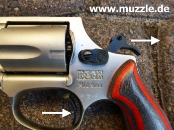 Bilder unten: Der UMAREX-“RECK” Schreckschussrevolver (links) und der UMAREX-Schreckschussrevolver mit